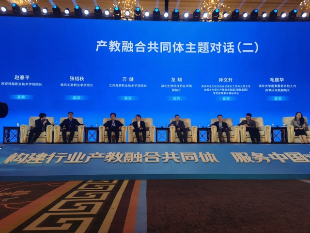 在产教融合共同体主题对话环节,万健就产教融合共同体有关问题代表学校作了交流发言。他认为产教融合共同体应具备四个要素:一是共同目标。培养大国工匠、卓越技术技能人才,支撑行业、产业发展,服务区域发展、服务国家战略应该成为共同体每个成员共同的价值追求。二是统一标准。共同体成员要共同推动实现企业生产标准、员工职业标准、院校教学标准、职业资格证标准的一致性。三是长效机制。争取外源性激励补偿,建设校企深层互惠能力。四是政行企校多主体协同发力。建成的产教融合共同体应是一个具有行业性、区域性、专业性的政行企校高度融合、协同发力的组织。他以泛长三角港口与航运国际职业教育集团为例,重点从“卓越海员培养计划”的组织实施,阐述了学校在产教融合共同体领域的实践。