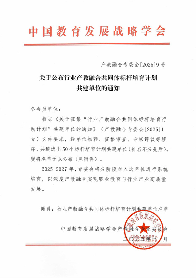 行业产教融合共同体标杆培育计划由中国教育发展战略学会产教融合专业委员会发起,面向全国职业院校开展遴选。该计划以“专家遴选-精准诊断-方案共创-学术引领-交流突破-模式沉淀”为实施路径,通过系统培育,聚集新质生产力发展需求,致力于打造具有行业适应性、区域辐射力的标杆行业产教融合共同体,推动教育链、人才链、产业链、创新链的深度融合与价值共创。